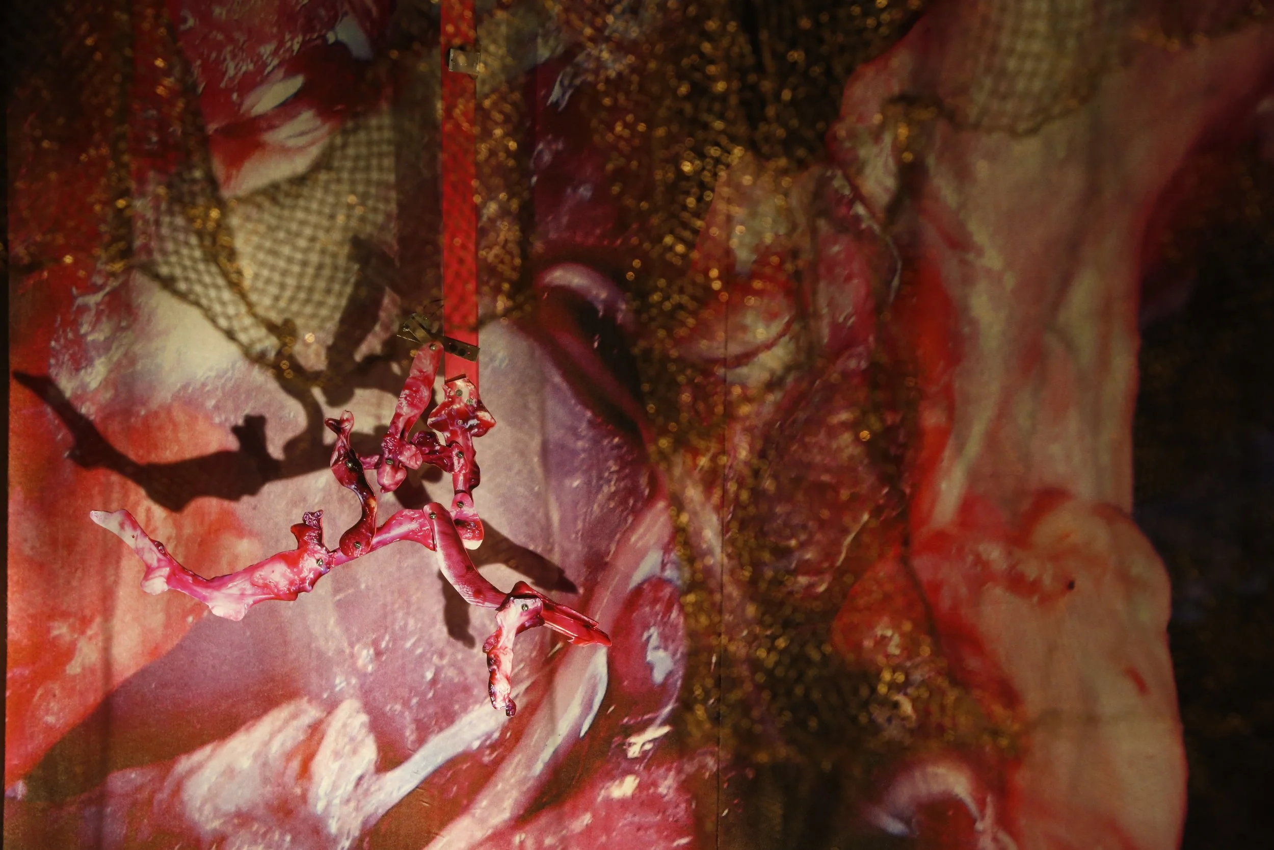 hand-sewn recycled mesh fruit bags, velvet, wood, motion detector
